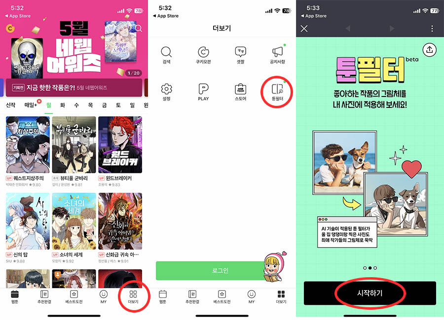 툰필터를 선택하고 시작하기 버튼을 터치합니다.